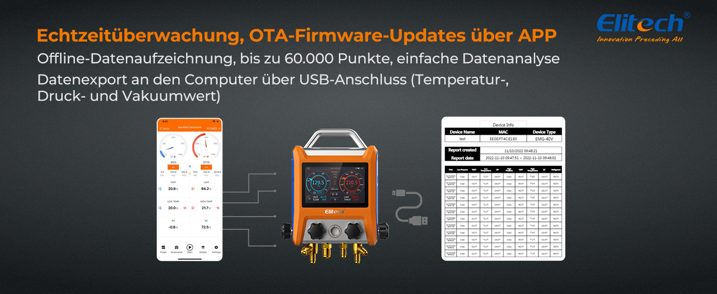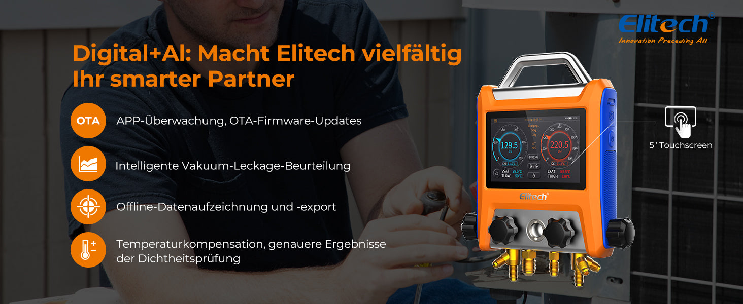 Der Elitech EMG-40V, ein intelligentes, modernes digitales Verteilermessgerät, ermöglicht schnelle Messungen und eine intuitive Bedienung sowohl über ein großes Grafikdisplay als auch über eine Smartphone-App. Der Touchscreen bietet Ihnen alle wichtigen Werte wie Druck, Vakuum und Temperatur auf einen Blick. Das Gerät ist ideal für die tägliche Inspektion und Wartung von HVAC/R-Systemen geeignet.
