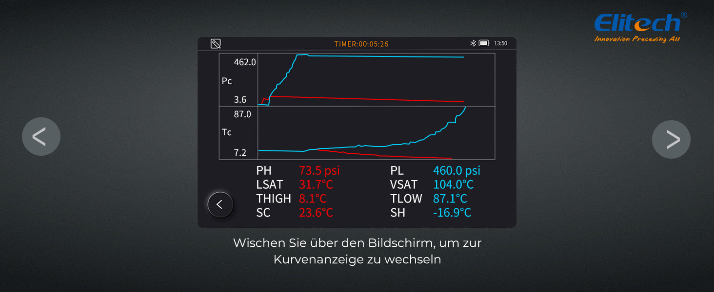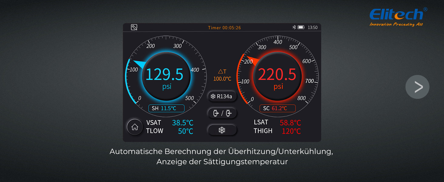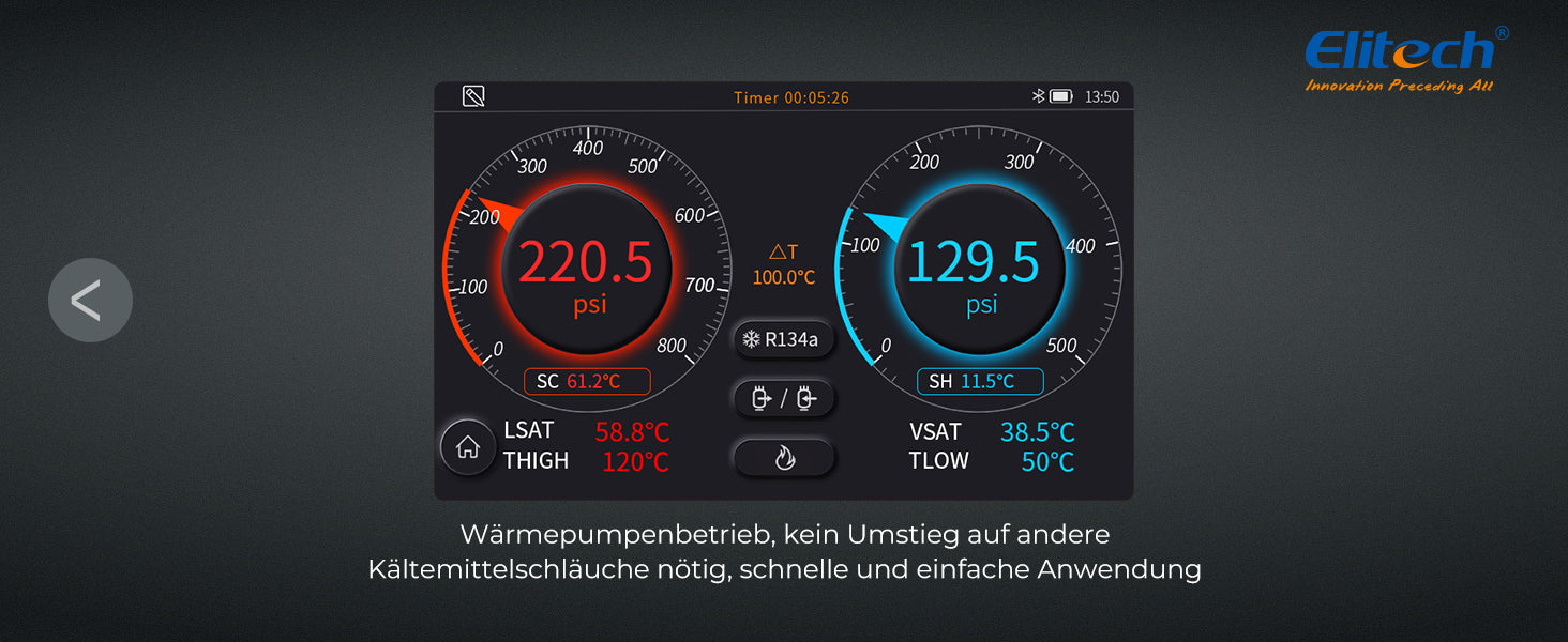 Wechsel zwischen Heiz- und Kühlmodus ohne Austausch der Kältemittelschläuche. Automatische Berechnung von Überhitzung und Unterkühlung.