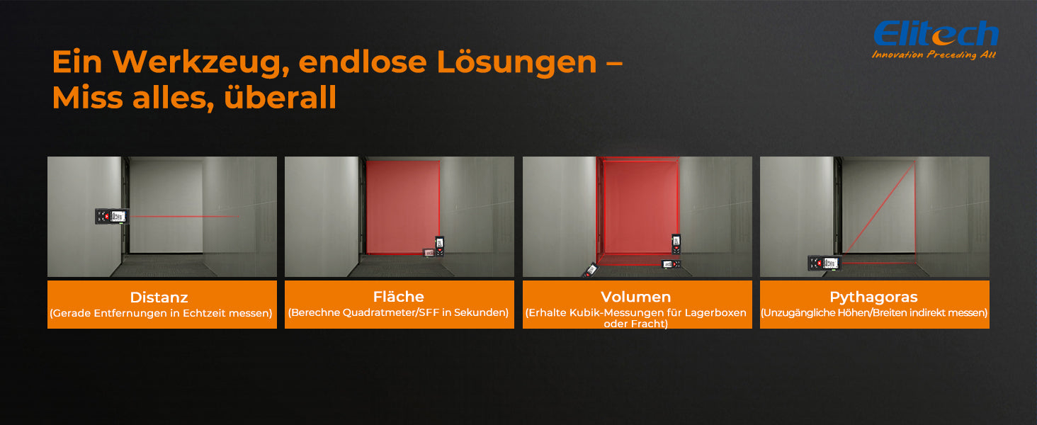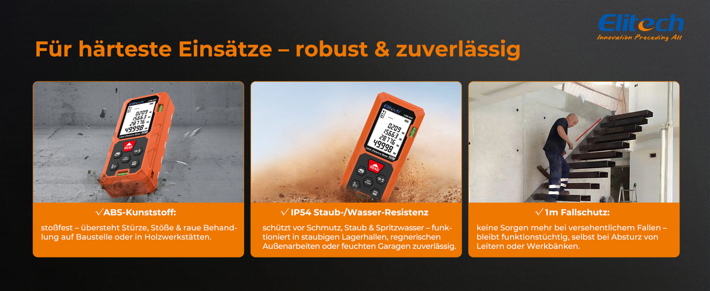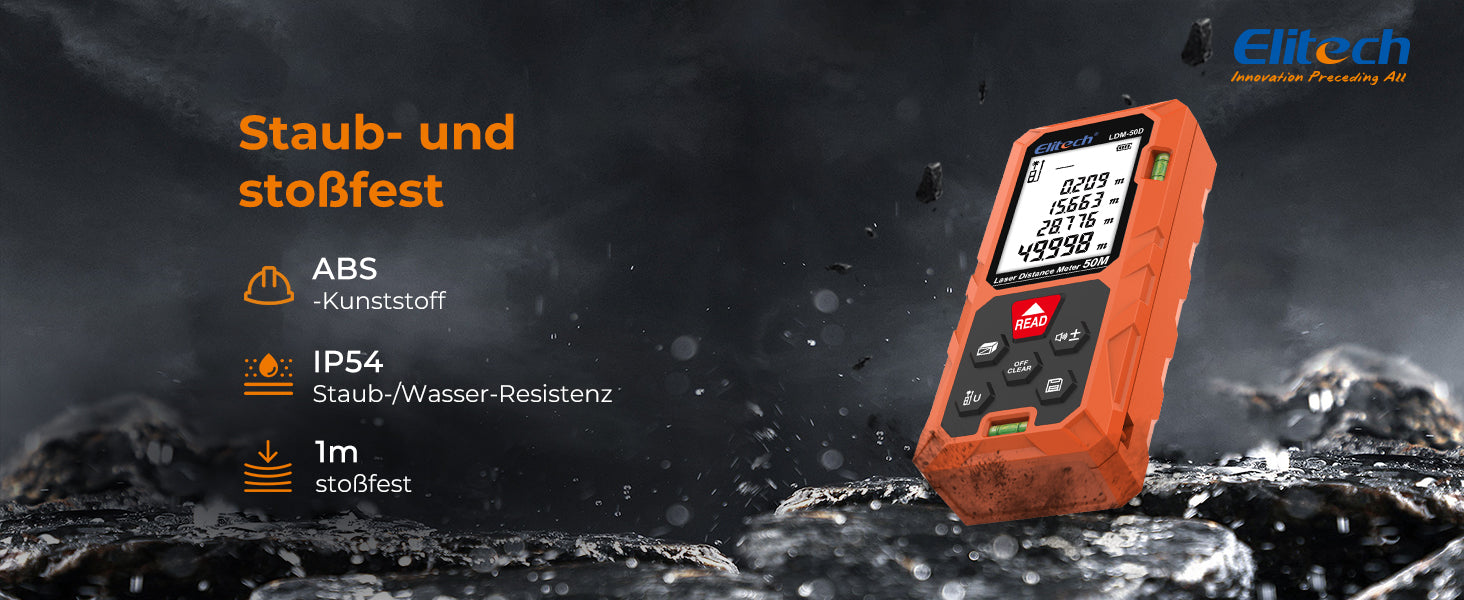 Der Elitech LDM-50D Laser-Entfernungsmesser bietet schnelle und präzise Messungen bis zu 50 m (±2 mm). Er verfügt über Flächen-, Volumen- und Pythagoras-Modi, ein hintergrundbeleuchtetes LCD, Einheitenumschaltung, 99 Datenspeicherplätze und ein kompaktes, benutzerfreundliches Design – perfekt für Heimwerker, Wohnraumgestaltung oder den professionellen Einsatz.