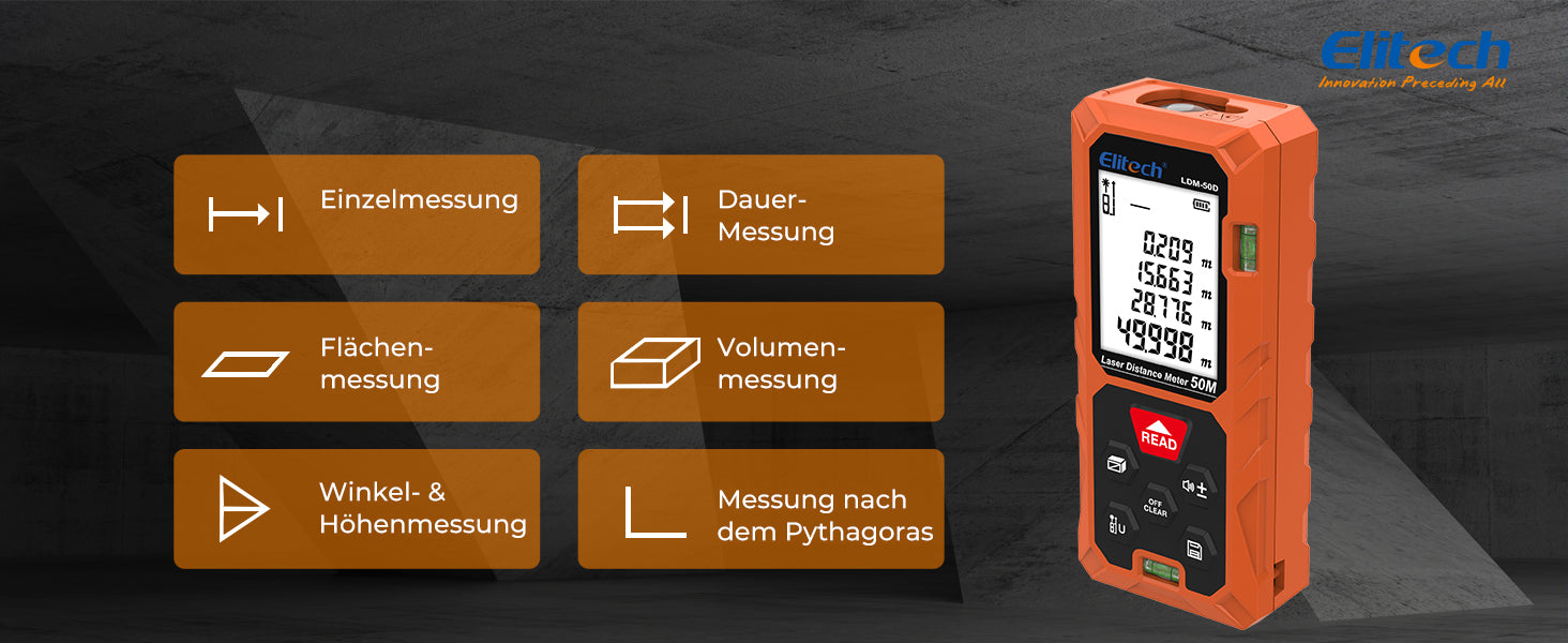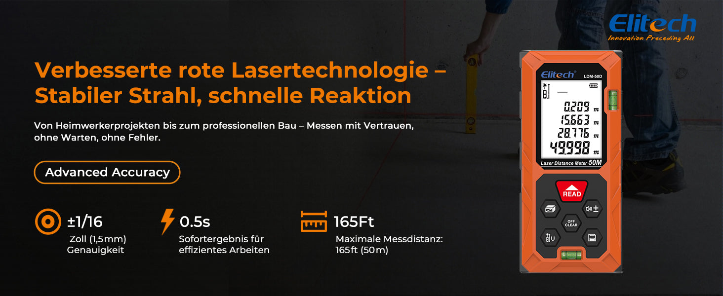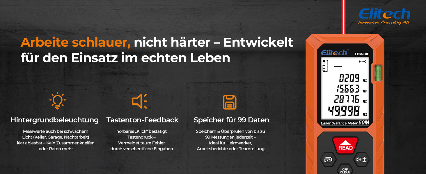 Elitech LDM-50D Laser-Entfernungsmesser 50 m, Digitales Messgerät mit Flächen-/Volumen-/Pythagoras-Funktion, hintergrundbeleuchtetem LCD, 99 Datensätzen, ±2 mm Genauigkeit, umschaltbaren Einheiten (ft/in/m), ideal für Heimwerker & Innenraumgestaltung