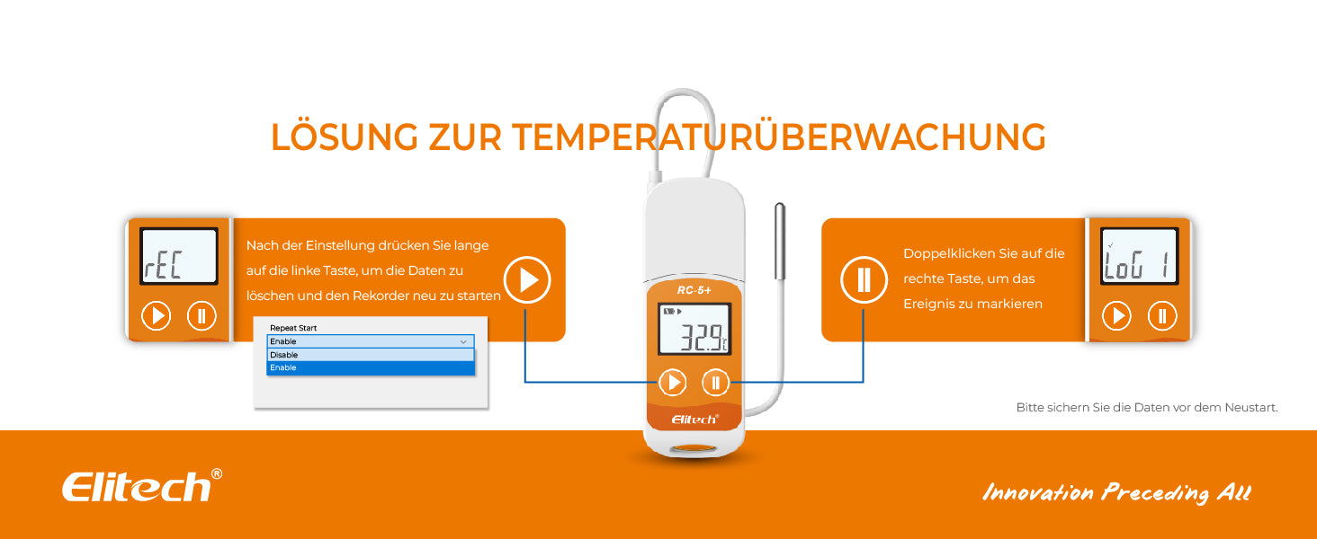Drucktaste: Konfigurierbar. Drücken Sie 4 Sekunden lang die Wiedergabetaste am Logger, um die Aufzeichnung zu starten, während die Pausentaste dazu dient, die Aufzeichnung zu stoppen.