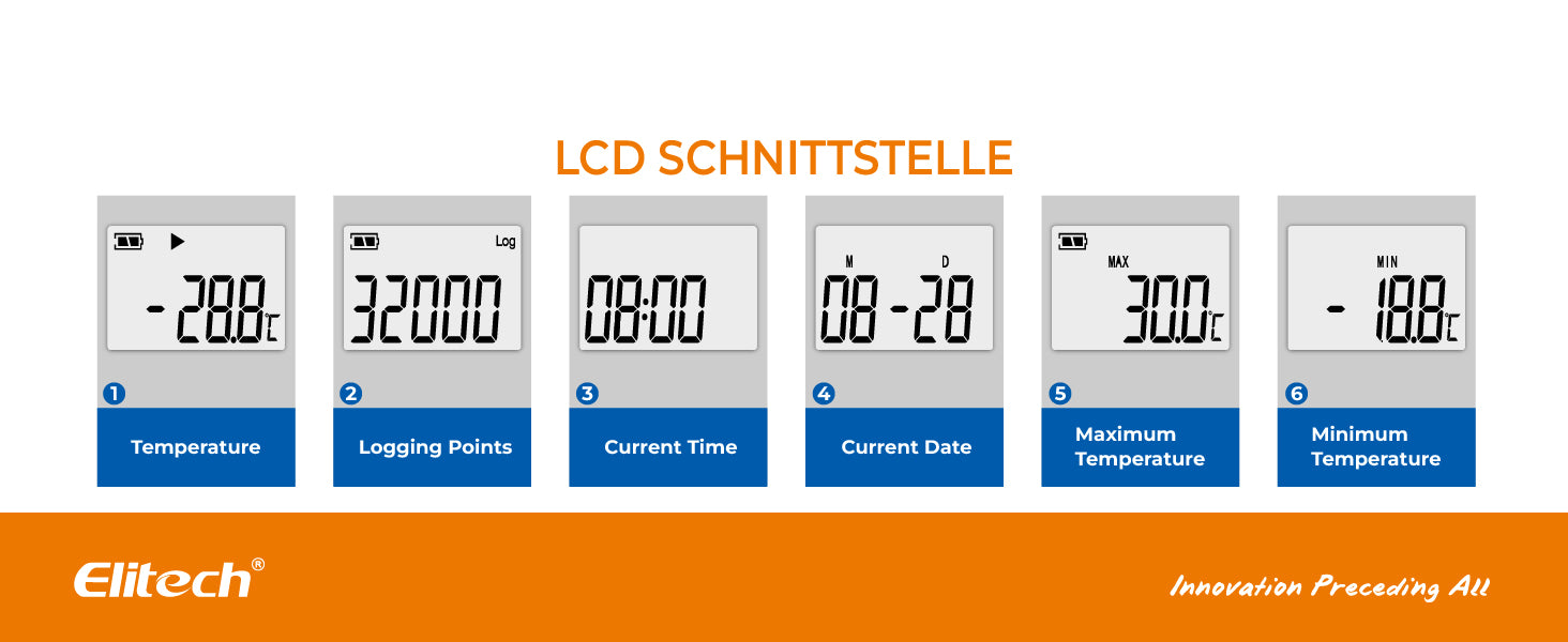 Protokollierungsintervall: Konfigurierbar zwischen 10 Sekunden und 24 Stunden. Das Protokollierungsintervall gibt an, wie oft der Logger einen Messwert aufzeichnen soll. Es kann 10 Sekunden, 1 Minute oder 1 Tag sein.