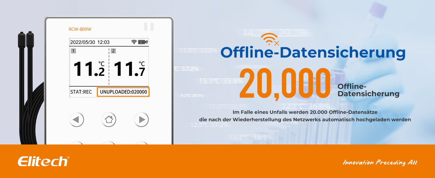 Der drahtlose Temperaturdatenlogger RCW-800W-TDE von Elitech verfügt über zwei Temperatursensoren. Mit einem eingebauten wiederaufladbaren Lithium-Akku kann es selbst im Falle eines Stromausfalls im Kühlhaus das Hochladen von Daten in Echtzeit und einen Plattformalarmdienst bereitstellen. Exportieren Sie Daten flexibel in mehreren Formaten über die Cloud-Plattform.
