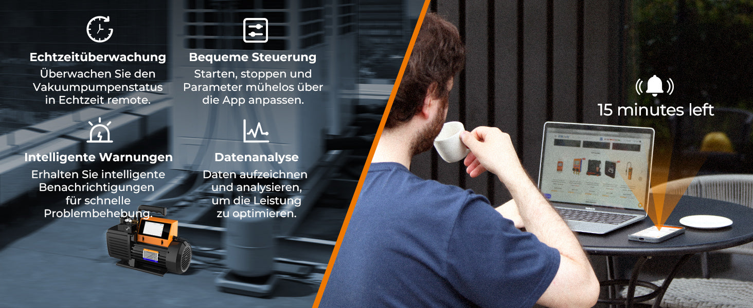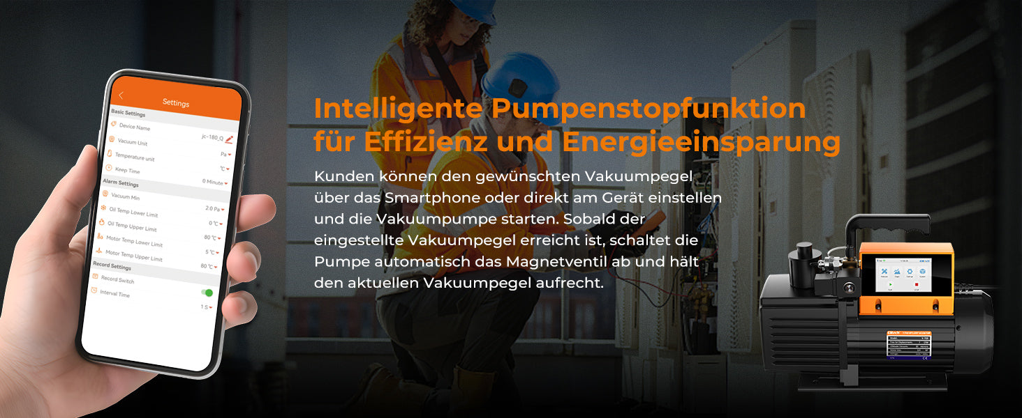 - Intelligente Steuerung – Motor und Magnetventil schalten sich automatisch ab, sobald der programmierte Vakuumwert erreicht ist. Wenn die Betriebstemperatur der Pumpe aufgrund eines Motorausfalls oder unzureichenden Öls ungewöhnlich hoch ist, schließt die Pumpe automatisch das Magnetventil, um sie vor größeren Defekten zu schützen.