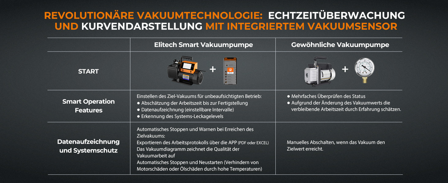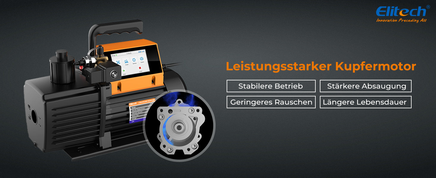 Die zweistufige Vakuumpumpe Elitech V700 ist eine intelligente Vakuumpumpe, die per APP über eine Bluetooth-Verbindung in einer Entfernung von maximal 30 Fuß/10 m gesteuert werden kann. Die Pumprate beträgt 3 L/S (7 CFM) und die Motorleistung beträgt 3/4 PS (550 W).