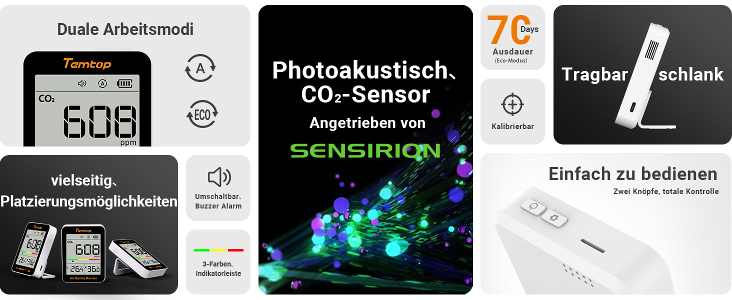Kostengünstig und 70 Tage Standby – Der neueste photoakustische CO2-Sensor verfügt über einen intelligenten Algorithmus, bietet zwei Erkennungsmodi und eine Betriebsdauer von bis zu 70 Tagen! Er bietet Ihnen den kostengünstigsten CO2-Detektor